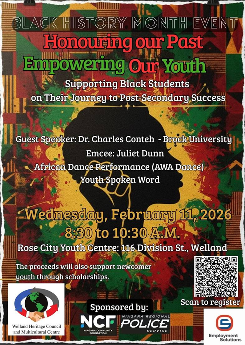 The Welland Heritage Council and Multicultural Centre is hosting their annual Black History Celebration on Feb 11, 2026 from 8:30 to 10:30 am. At Rose City Youth Centre, 116 Division St., Welland. See the poster below for more information. It’s $45 plus admin fees.